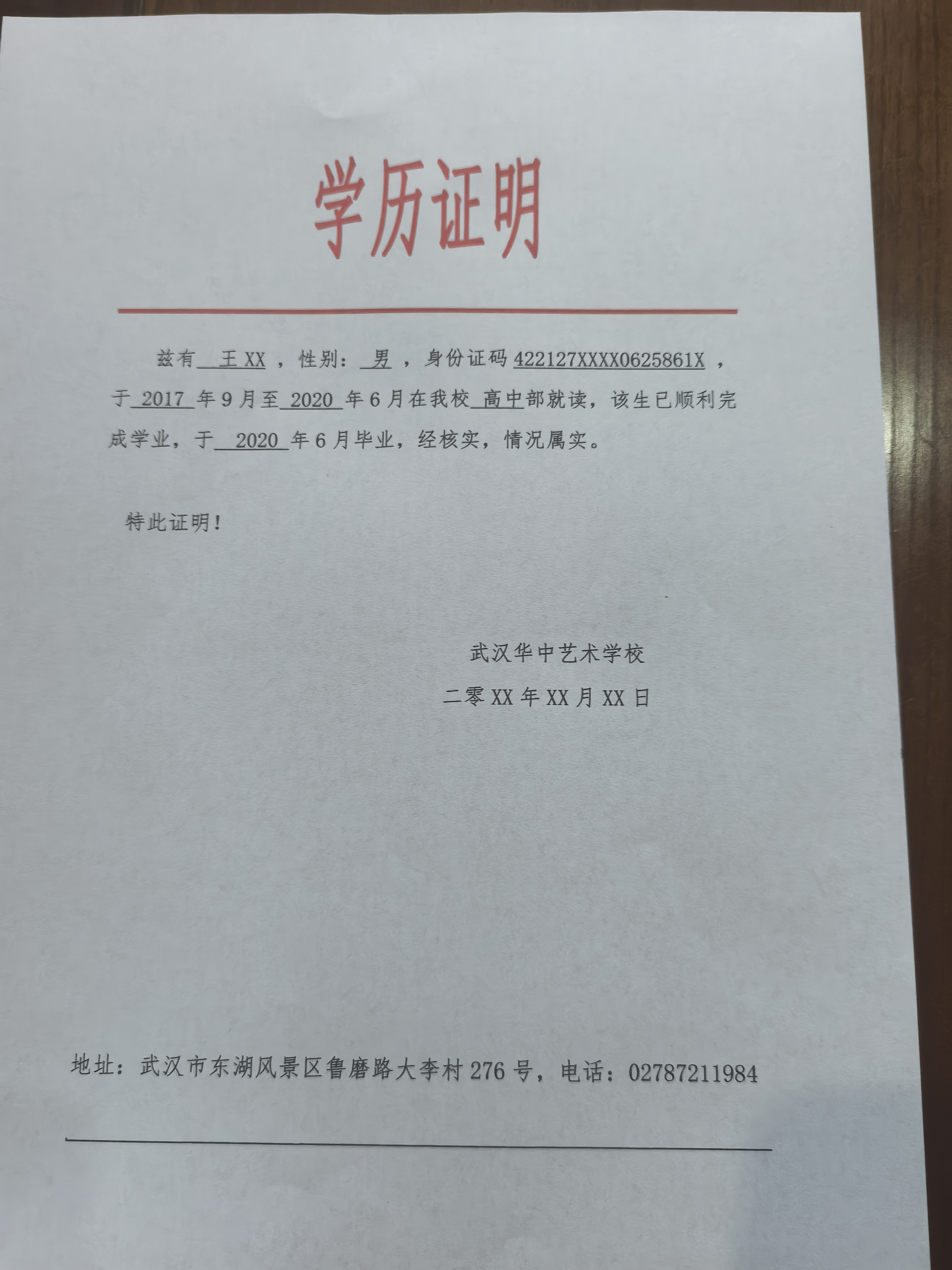 武汉华中艺术学校学历证明
